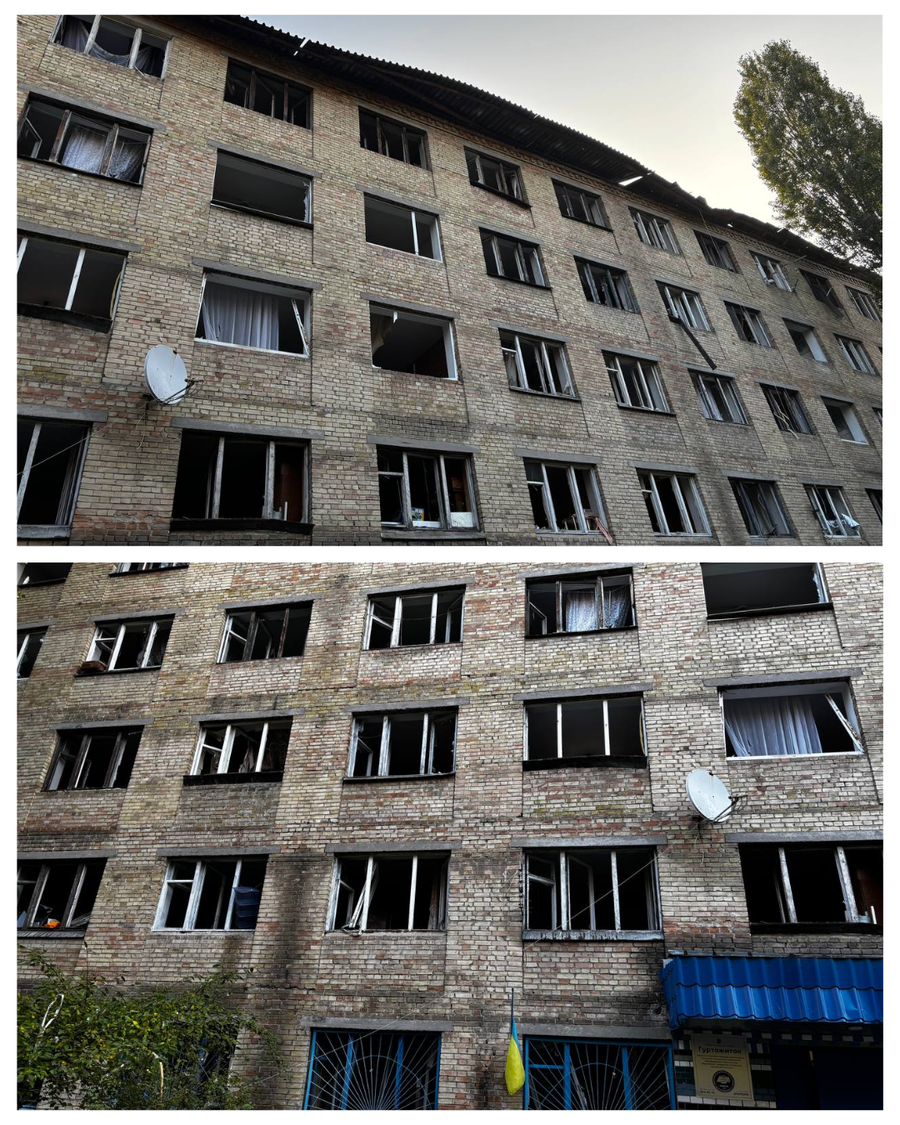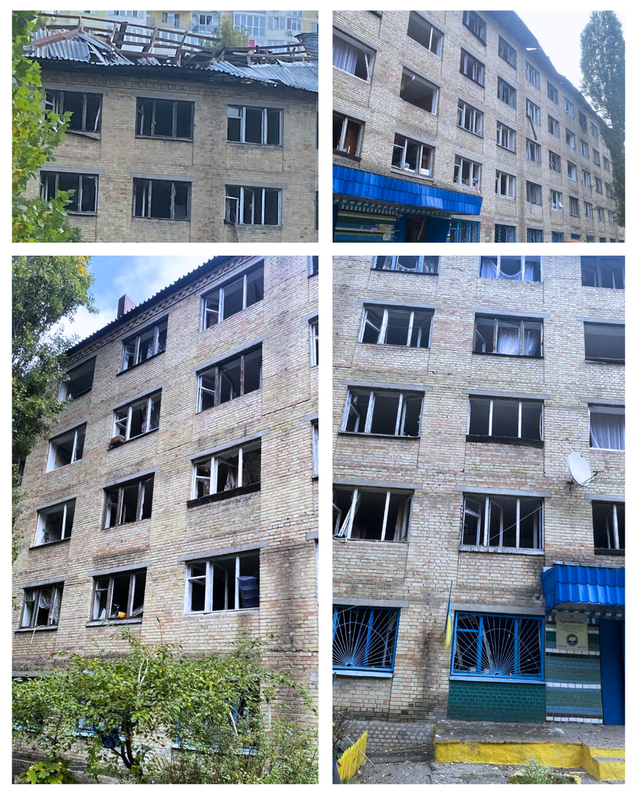 У результаті вибухової хвилі та уламкових уражень значно пошкоджено дах будівлі та вибито 230 віконних блоків. Також постраждали житлові приміщення, коридори та місця загального користування.