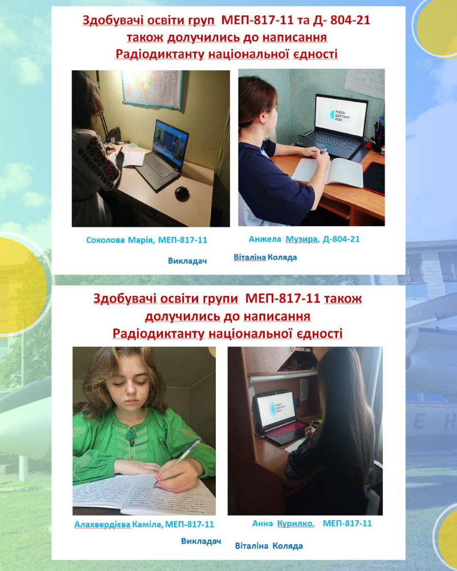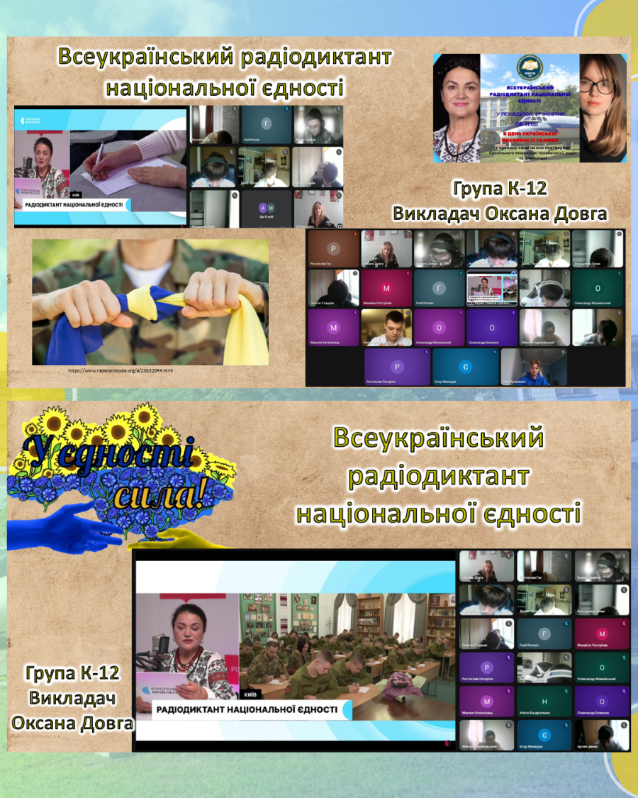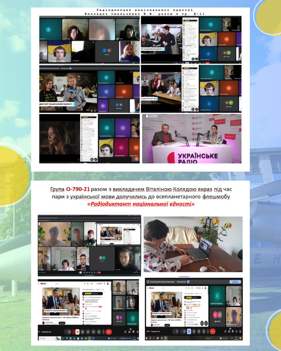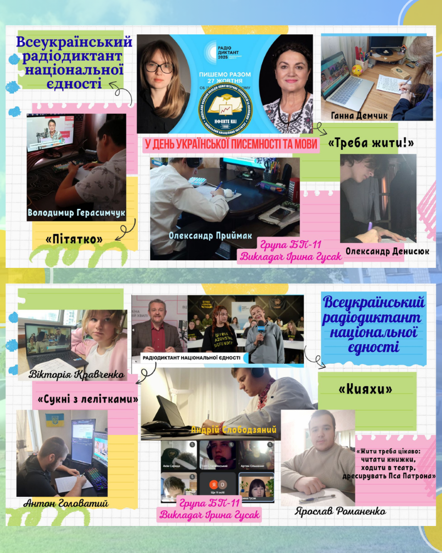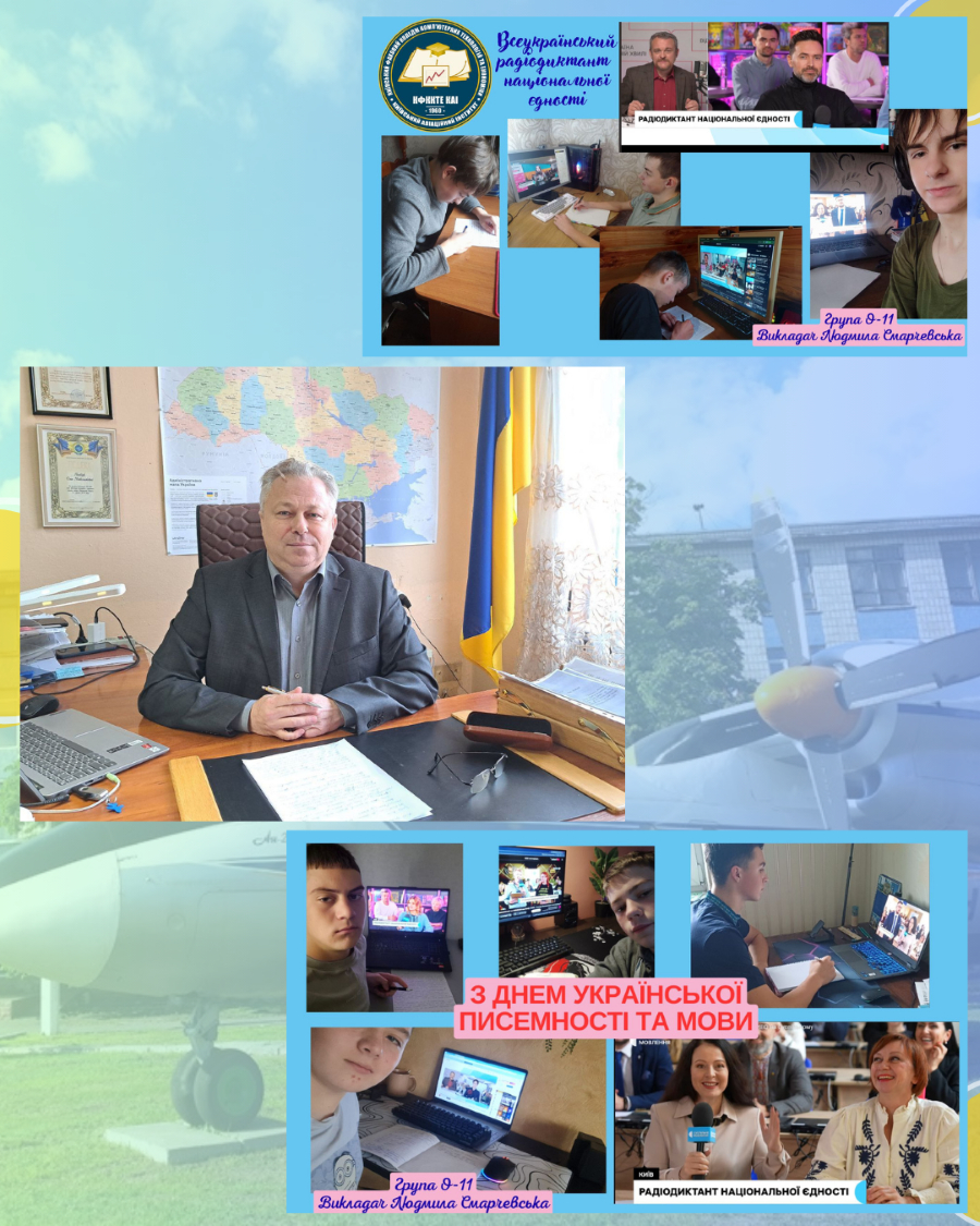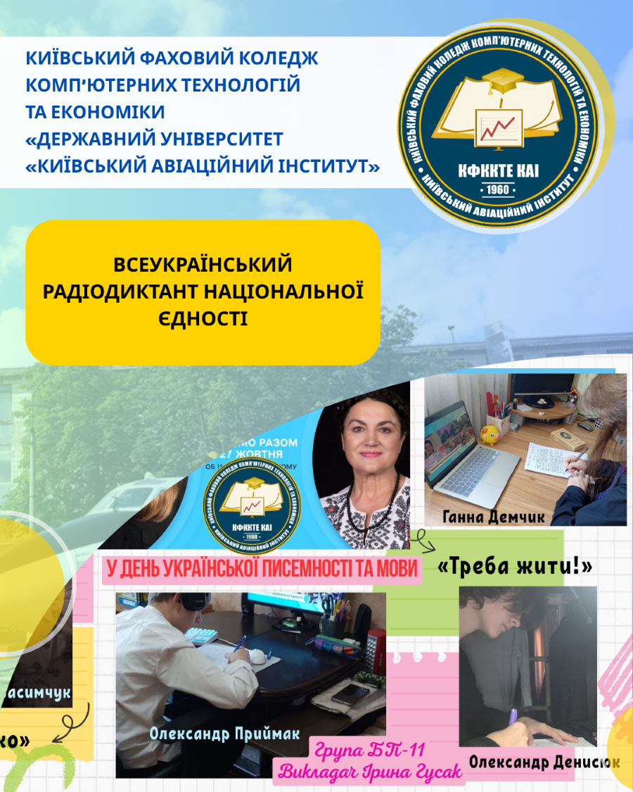 Традиційно у День української писемності та мови викладачі-філологи разом зі здобувачами освіти Київського фахового коледжу комп'ютерних технологій та економіки Державного некомерційного підприємства "Державний університет "Київський авіаційний інститут" долучилися до флешмобу- написання Всеукраїнського радіодиктанту національної єдності — події, яка об’єднує українців у різних куточках світу та популяризує українську мову. До таких заходів долучається все більше й більше коледжійної спільноти.