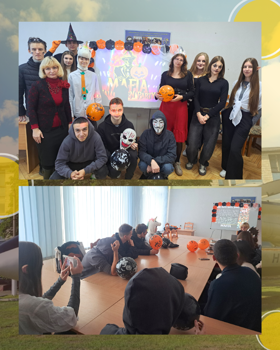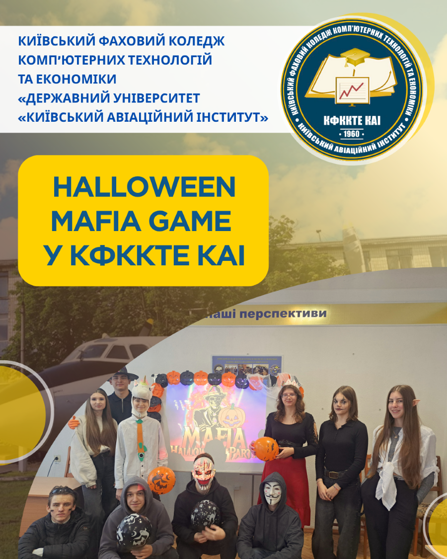 29 жовтня у Коледжі комп’ютерних технологій та економіки КАІ відбулася тематична гра «Мафія» у стилі Гелловіну. Атмосфера загадковості, яскраві костюми та відчуття інтриги створили справжнє свято емоцій і перевтілень. Адже, як кажуть, не страшно побачити привидів минулого — страшно не визначити, хто мафія!