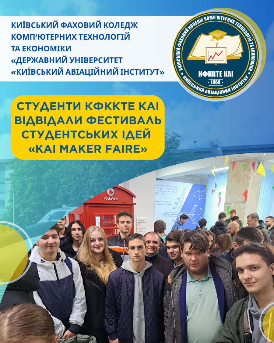 30 жовтня 2025 року студенти КФККТЕ КАІ разом із викладачами та представниками адміністрації відвідали фестиваль студентських ідей KAI Maker Faire, який традиційно зібрав найкреативніших і найініціативніших молодих винахідників Київського авіаційного інституту.