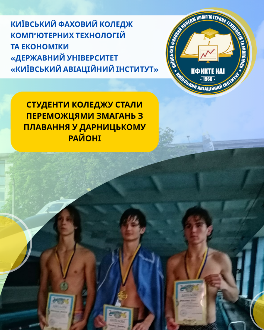 Студенти Коледжу комп'ютерних технологій та економіки здобули тріумфальну перемогу на змаганнях з плавання, що відбулися 5 листопада 2025 року. Захід проходив у рамках Спартакіади серед студентів вищих навчальних закладів Дарницького району.