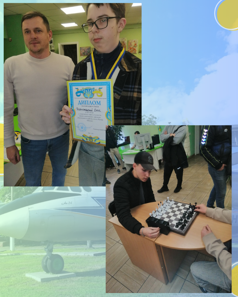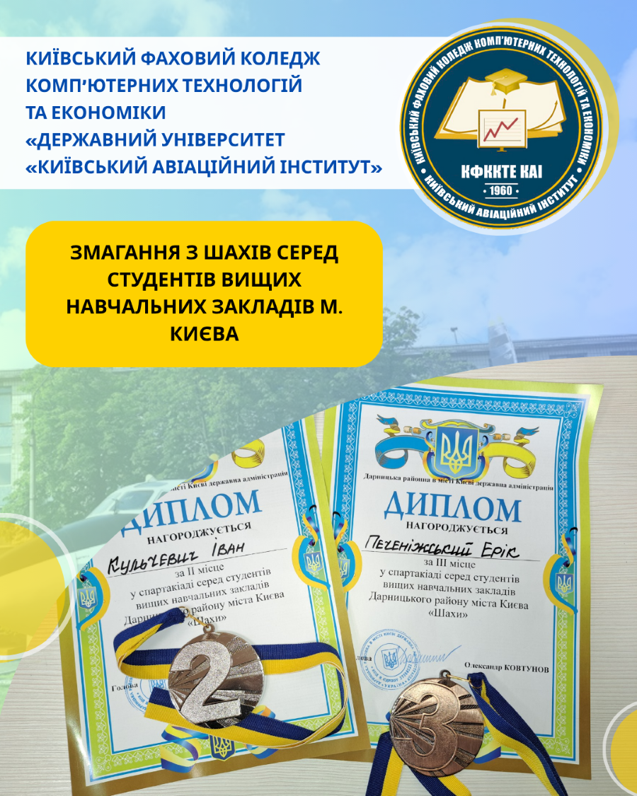 Вітає з перемогою учасників змагань, які посіли місця: Шахи: 2 місце Кульчевич Іван (група А-759-41) 3 місце Печежинський Ерік (група Р-798-21)