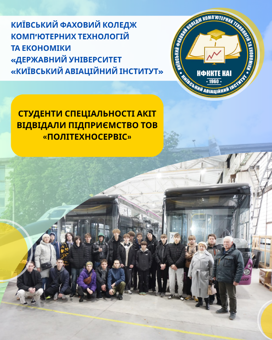 13 листопада 2025 року студенти 1–2 курсів спеціальності «Автоматизація, комп’ютерно-інтегровані технології та робототехніка» разом із викладачами випускової комісії автоматизації, робототехніки та машинобудування Андрієм Сороченко, Олегом Глеєм, Іриною Спис, Іриною Полющенко здійснили навчальну екскурсію на підприємство ТОВ «Політехносервіс».