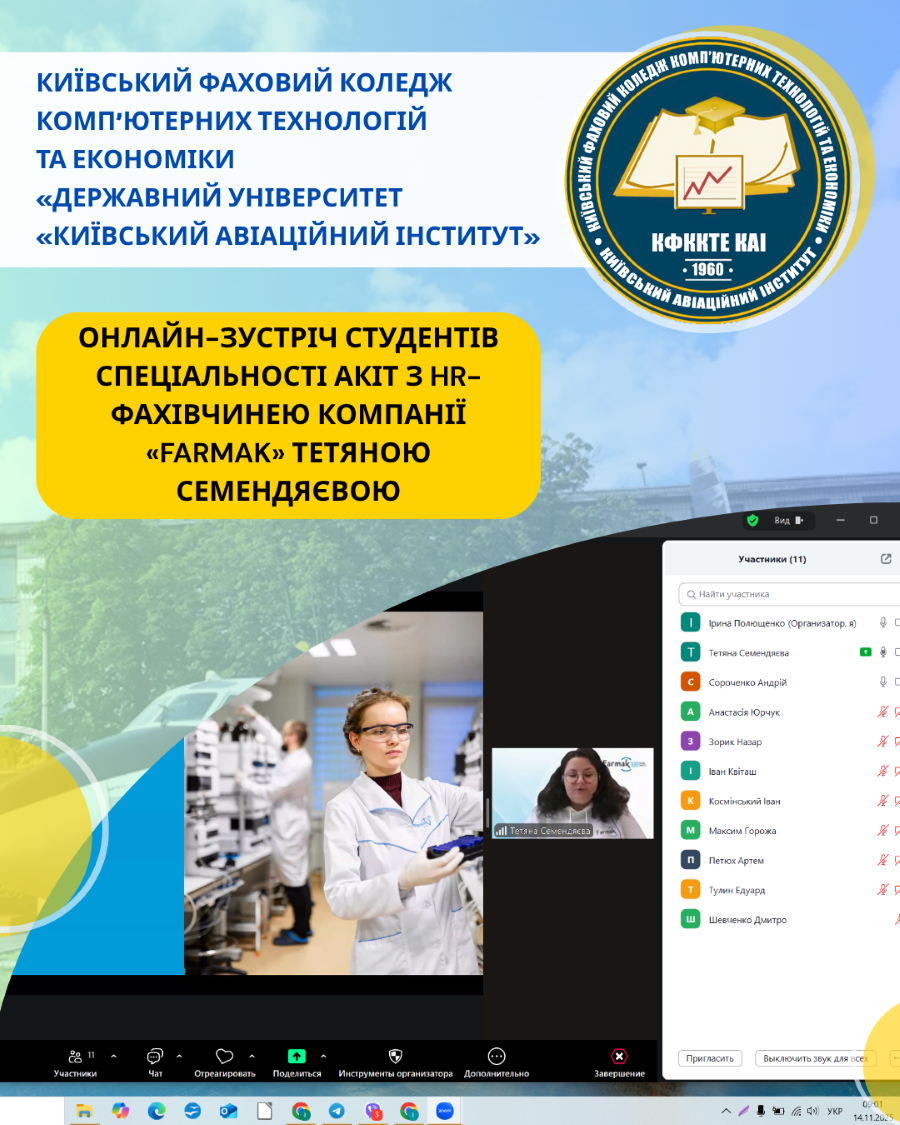 Студенти 3 курсу спеціальності «Автоматизація, комп’ютерно-інтегровані технології та робототехніка» 14 листопада 2025 року взяли участь в онлайн-зустрічі з Тетяною Семендяєвою, HR-фахівчинею відділу підбору та адаптації персоналу провідної фармацевтичної компанії «Farmak».
