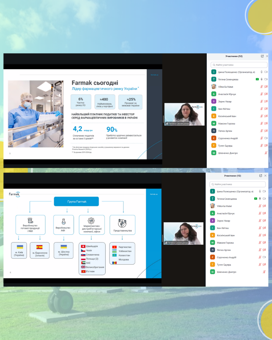 Під час зустрічі пані Тетяна представила студентам змістовну та актуальну інформацію про діяльність компанії, а саме: історію розвитку «Farmak», ключові етапи становлення та лідерські позиції на ринку; цінності компанії та сучасний підхід до виробництва лікарських засобів; структуру підприємства, виробничі цехи, лабораторні комплекси та високотехнологічні ділянки; міжнародні представництва «Farmak», що працюють у різних країнах світу; можливості для студентів і випускників, зокрема етапи працевлаштування, вимоги до кандидатів і програми адаптації молодих фахівців.