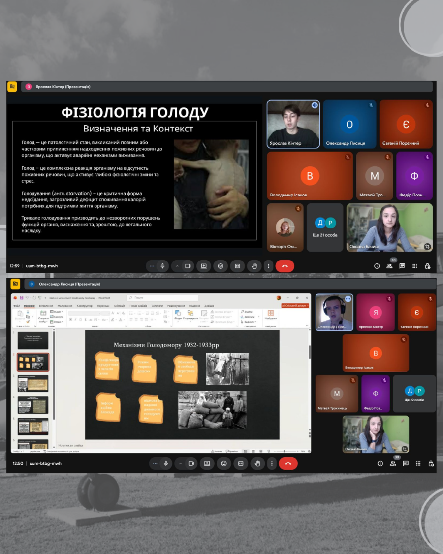 Олександр Лисиця виступив з доповіддю «Законні механізми Голодомору 1932-1933 років: не голими руками», висвітлив постанови радянських органів влади, які давали «законне право» вчиняти голодомор. Ярослав Кінтер висвітлив особливості голоду як засобу вбивства українських селян. Вікторія Назаренко розповіла про торгзіни – торгівельні пункти, в яких радянські громадяни за цінні метали обмінювали продукти харчування, щоб вижити у голодні роки. А Володимир Ісаков висвітлив становище українських робітників в роки Голодомору 1932-1933 рр., опираючись на листи американського інженера Джері Бермана.