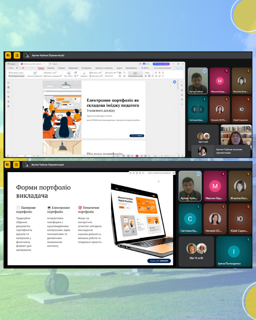 У ході заходу Артем Чуйков детально розкрив: значення портфоліо для сучасного педагогічного працівника; основні структурні складові, які мають бути представлені в портфоліо викладача; форми портфоліо та особливості їхнього застосування; переваги портфоліо як інструменту професійного зростання, самопрезентації та успішного проходження атестації.