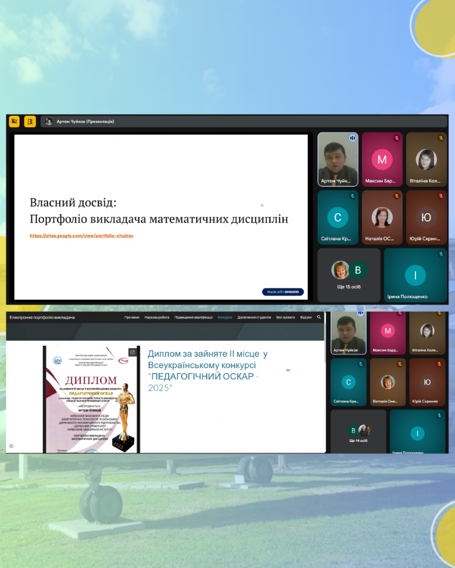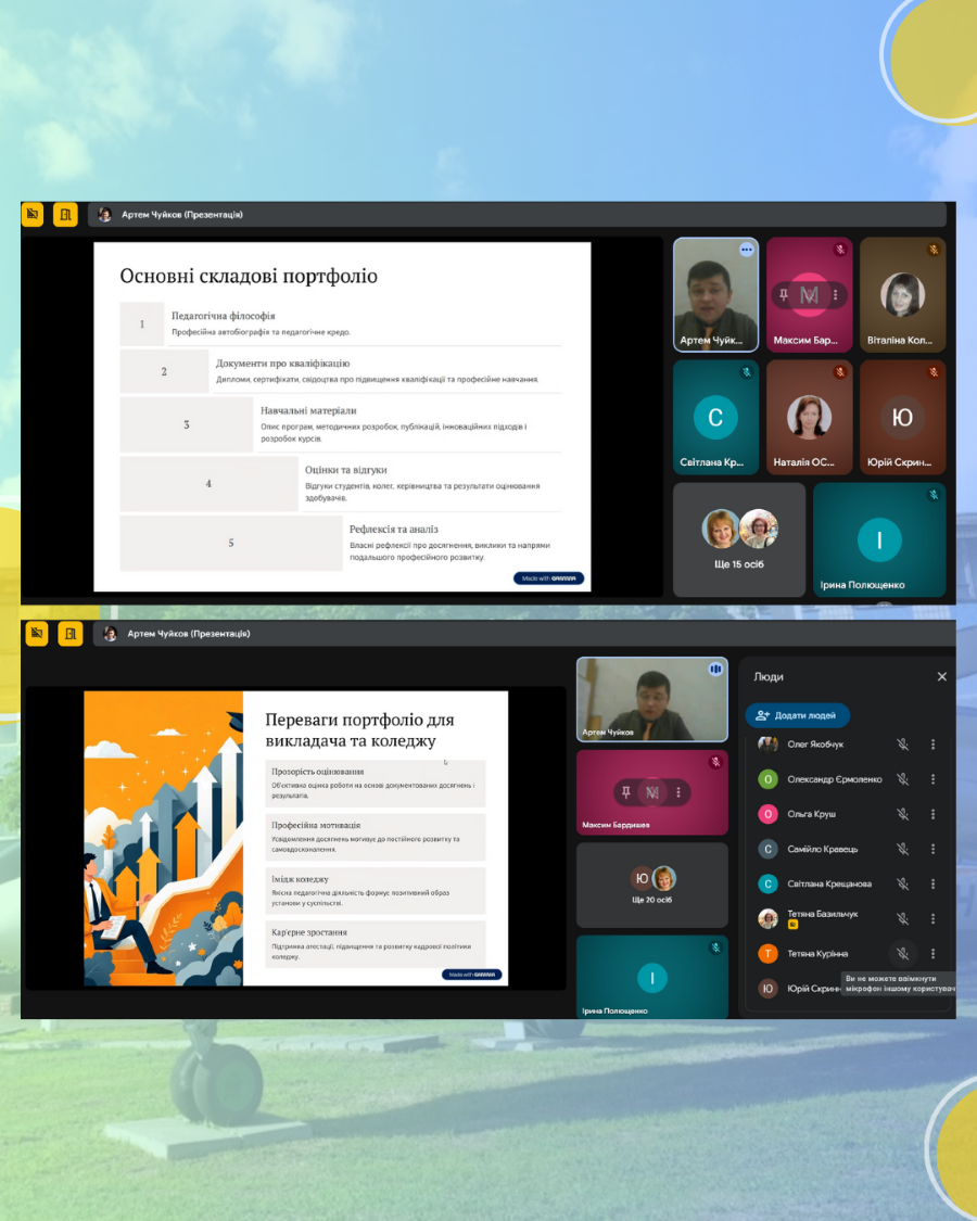 Особливу увагу було приділено практичним аспектам оформлення портфоліо. Артем Чуйков поділився власним досвідом і продемонстрував авторське портфоліо, яке у минулому навчальному році було подано на конкурс «Педагогічний Оскар» та отримало призове місце. Такий практичний приклад дав викладачам можливість побачити реальну модель якісно підготовленого портфоліо, а також зрозуміти, як відображати власні професійні досягнення, інноваційну діяльність і результати педагогічної роботи.