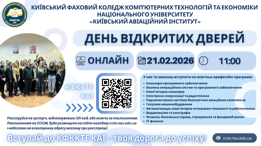 Вас щиро вітає Київський фаховий коледж комп'ютерних технологій та економіки Національного університету "Київський авіаційний інститут".