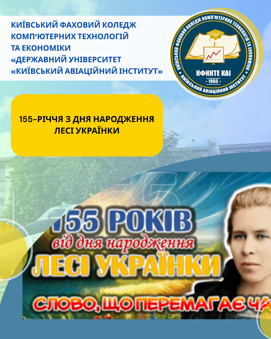 А якою вона була б, якби жила у 2026 році? Студенти КФККТЕ КАІ підготували проєкт, у якому створили образ сучасної Лесі – впевненої, сміливої, активної. Незмінним залишилося б головне – її внутрішня сила, глибока любов до України й непохитна віра в перемогу світла ( викладач Оксана Довга)