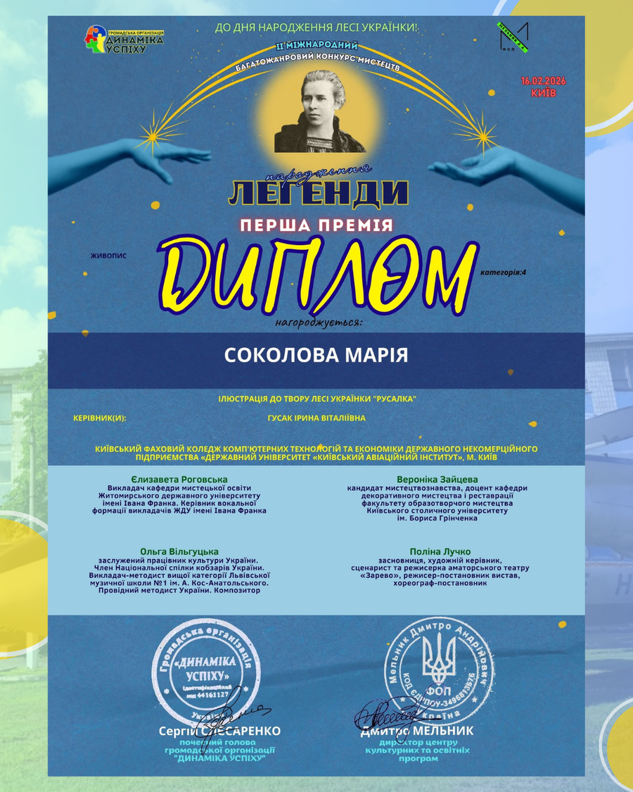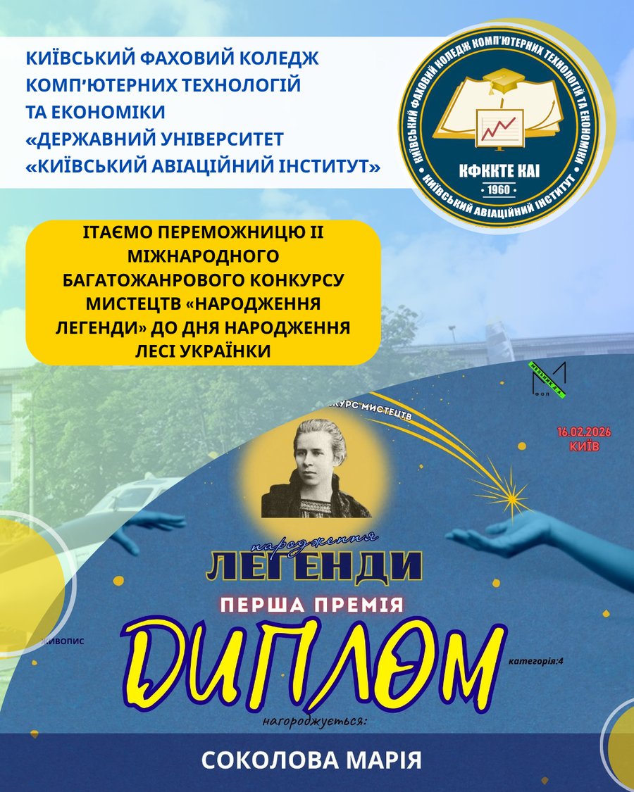 Марія СОКОЛОВА, студентка групи МЕП-817-11, здобула І місце (ПЕРШУ ПРЕМІЮ) у ІІ Міжнародному багатожанровому конкурсі мистецтв «НАРОДЖЕННЯ ЛЕГЕНДИ» до дня народження Лесі Українки. Викладач Ірина ГУСАК.