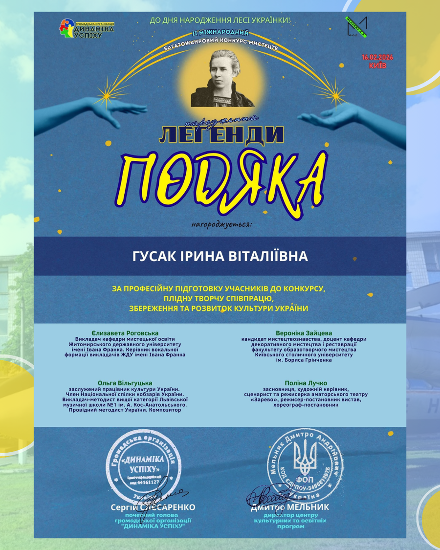 ВІТАЄМО ПЕРЕМОЖНИЦЮ ІІ МІЖНАРОДНОГО БАГАТОЖАНРОВОГО КОНКУРСУ МИСТЕЦТВ «НАРОДЖЕННЯ ЛЕГЕНДИ» до дня народження Лесі Українки