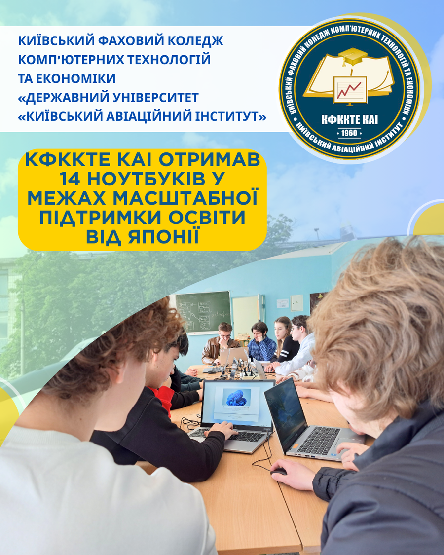 Київський фаховий коледж комп’ютерних технологій та економіки КАІ отримав 14 сучасних ноутбуків у межах проєкту «Невідкладне покращення обладнання для надання освітніх послуг». Це важливий крок у посиленні матеріально-технічної бази закладу та створенні ще більш ефективного освітнього середовища для студентів і викладачів.