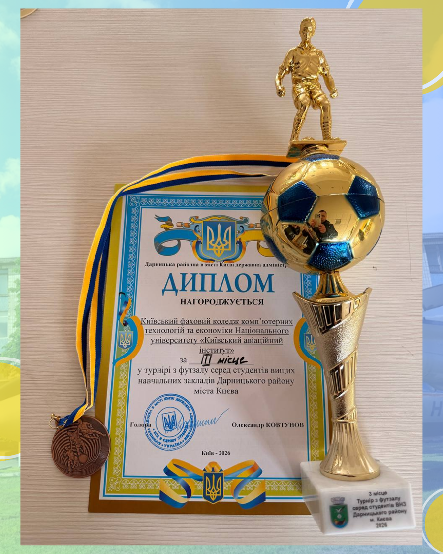 У цьому чемпіонаті під керівництвом Оголь Світлани Миколаївни та Бондаря Олександра Миколайовича взяли участь наші студенти ( Гудков В. ФІТ-11, Пасічник Д. А-31, Вовченський М. П-22, Єременко Д. ФІТ- 11, Олійник М. Ф-21, Хорошун Д. ФІТ 21, Бабій В. О-11, Тарахкотелик В. П-32, Лісовський Б. П-32) Збірна команда з футболу нашого коледжу здобула почесне призове ІІІ місце🏆