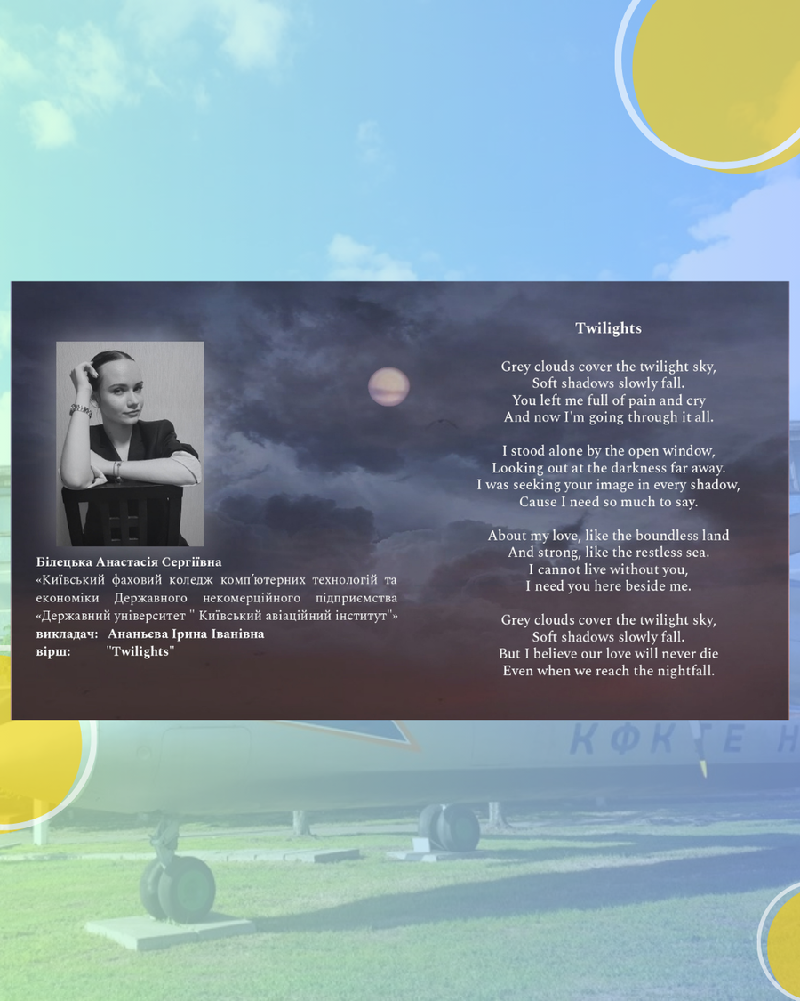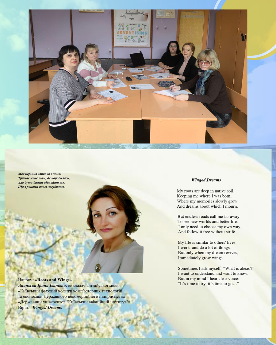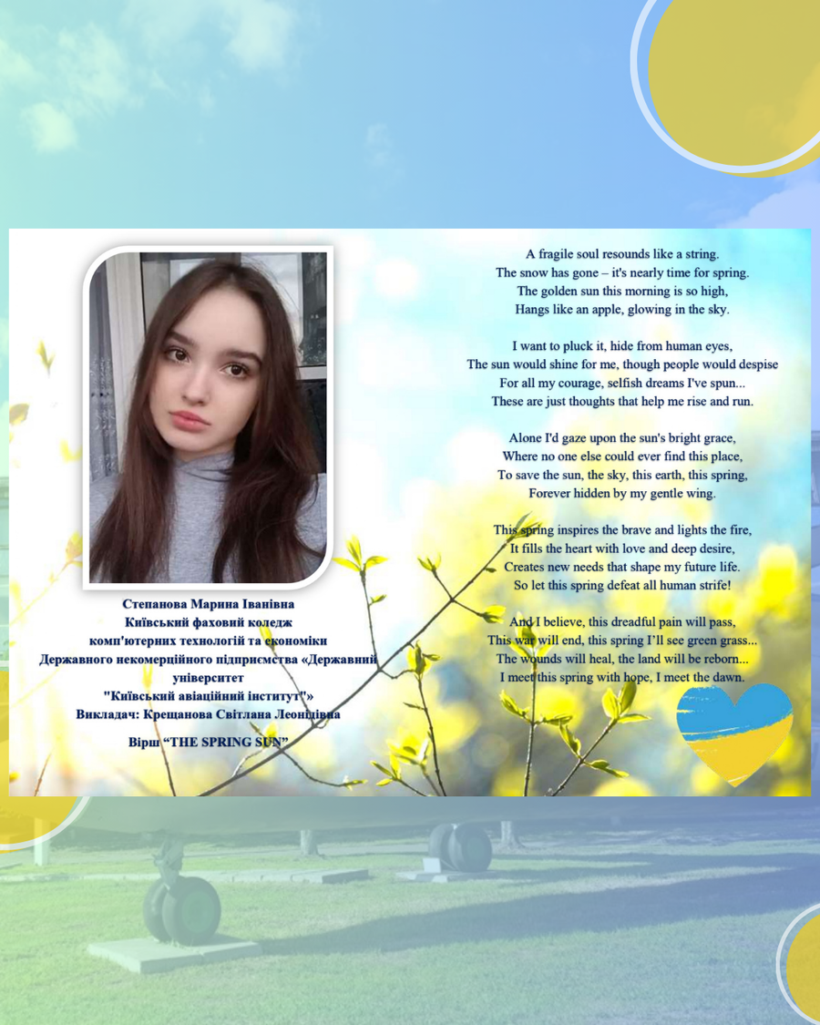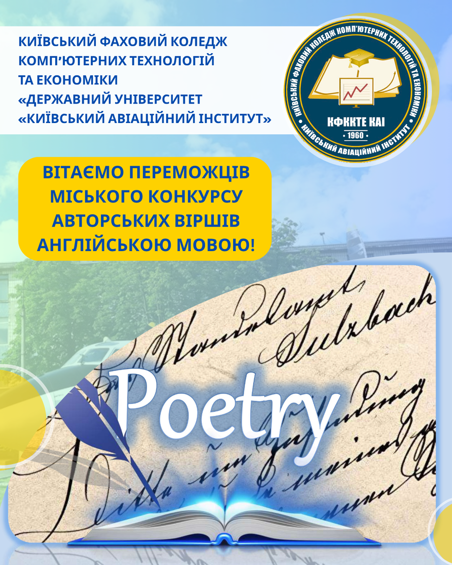 За результатами підведення підсумків студентка КФККТЕ КАІ Степанова Марина, гр. Ф-818-11 (вірш «The spring sun / Весняне сонце»), здобула І місце у номінації «Україна: сила стійкості» (підготувала викладач Крещанова С.Л.); студентка Білецька Анастасія, гр. БП-777-31 (вірш «Twilights / Сутінки»), посіла ІІ місце у номінації «Симфонія почуттів» (підготувала викладач Ананьєва І.І.). У конкурсі серед викладачів у номінації «Коріння та крила» І місце здобула викладач Ананьєва Ірина Іванівна (вірш «Winged Dreams / Крилаті мрії»).