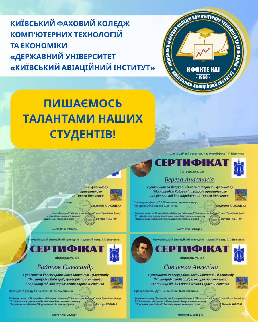 Виступи наших здобувачів освіти, створені для флешмобу «Ми нащадки Кобзаря», присвяченого 212 річниці від дня народження Тараса Шевченка, стали яскравим свідченням того, що українська душа незламна, а творчість — безмежна.