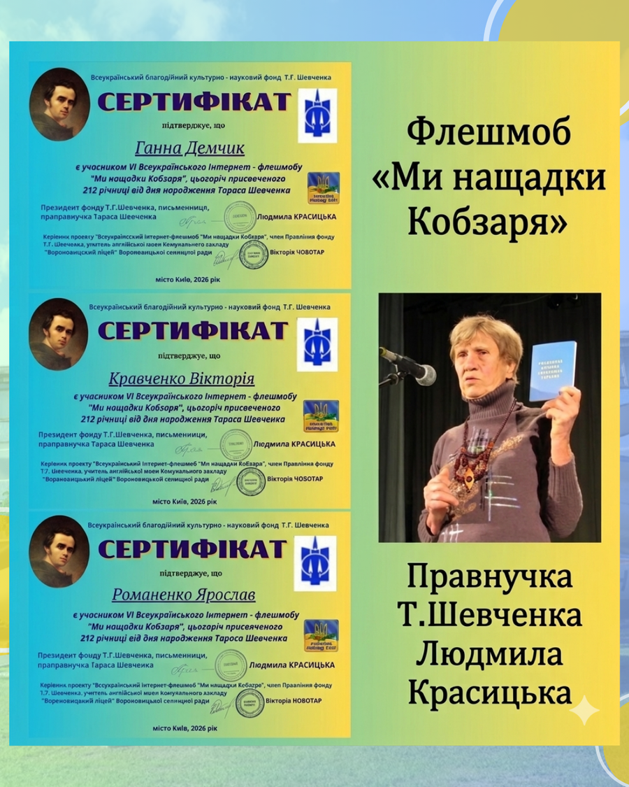 Усі учасники флешмобу отримали сертифікати з підписом правнучки Т.Шевченка Людмили Красицької.