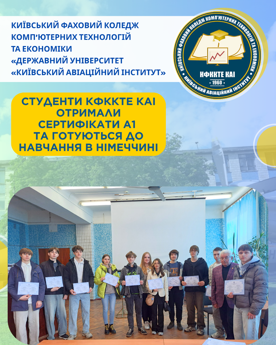 Першого квітня в Київському фаховому коледжі комп'ютерних технологій та економіки НАУ панувала особлива атмосфера, адже наші студенти зробили перший вагомий крок до міжнародного визнання. Після піврічного інтенсивного вивчення німецької мови на базі Німецько-Українського освітнього центру НУ «Львівська політехніка» юнаки та дівчата успішно склали іспити та підтвердили володіння мовою на рівень А1. Ця подія стала ключовим етапом у реалізації амбітного проєкту, який відкриває перед студентами двері до трирічного навчання та професійного розвитку в Німеччині. 📚📘📒
