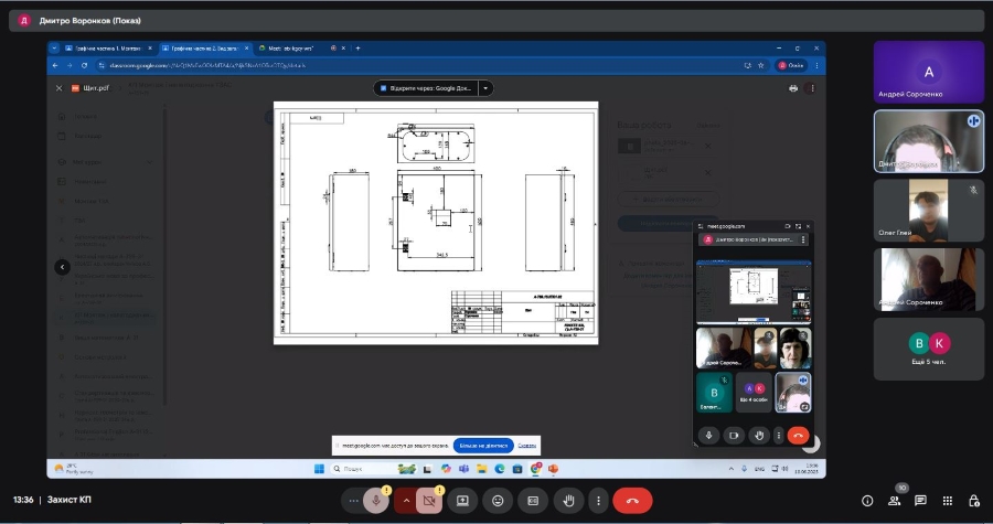 09-13 червня 2025р. на спеціальності 151 «Автоматизація та комп’ютерно-інтегровані технології», за допомогою платформи Google meet та з використанням дистанційних технологій відбувся онлайн захист курсових проектів з дисципліни «Монтаж і налагодження технічних засобів автоматизованих систем». Курсовий проєкт з відповідної навчальної дисципліни є невід’ємною частиною підготовки фахівців даної спеціальності, передбачений навчальним планом та графіком освітнього процесу.