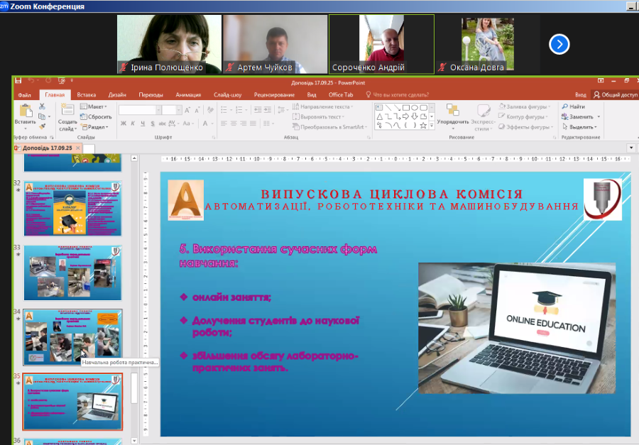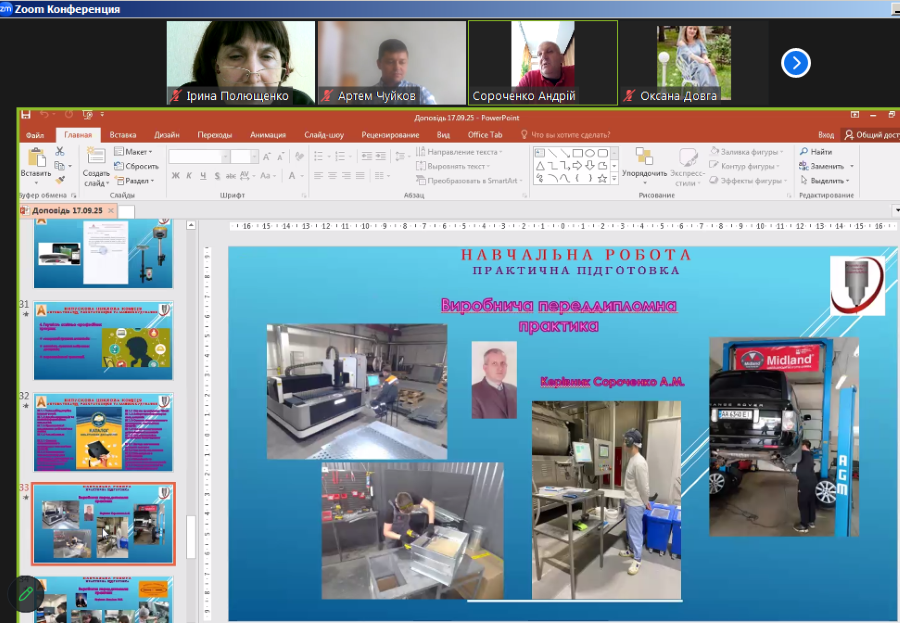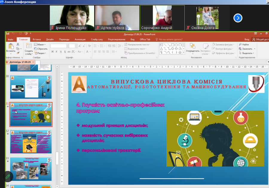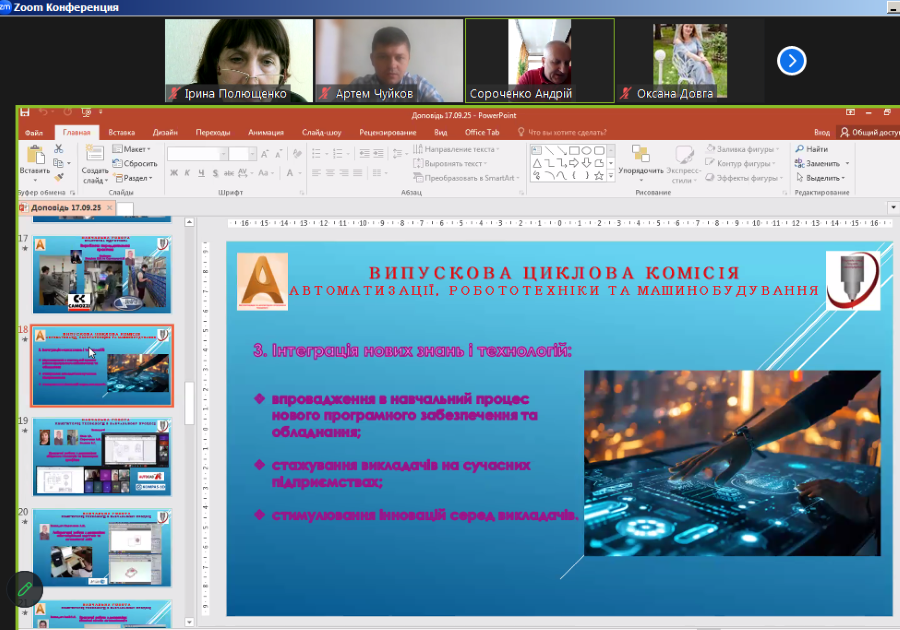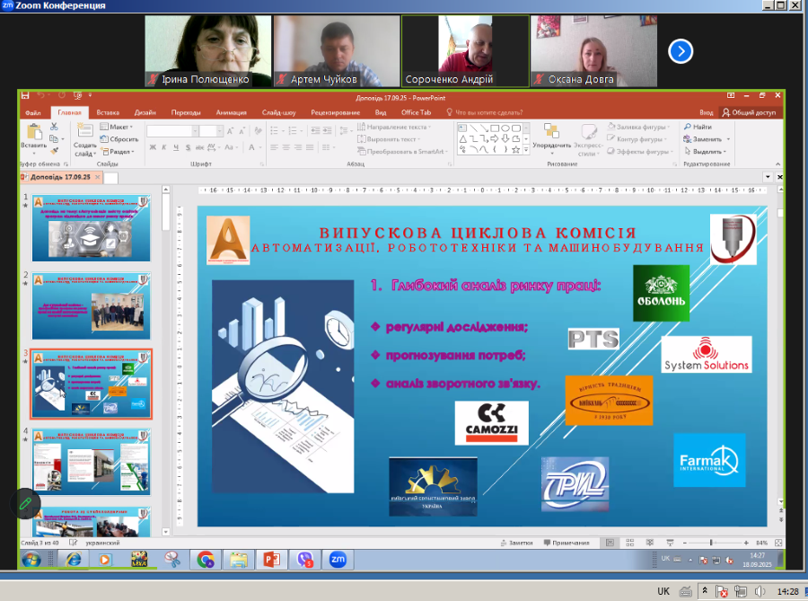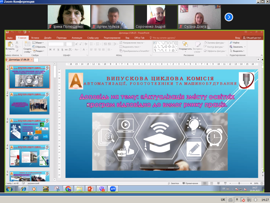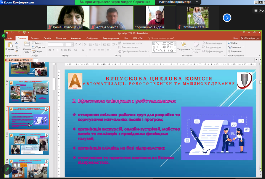 18 вересня 2025 року відбулося чергове засідання методичної ради в дистанційному форматі. Одним з доповідачем був голова ВЦК АРМ Андрій СОРОЧЕНКО. Головою комісії була представлена інформація роботи членів ВЦК АРМ з актуалізації змісту освітніх програм відповідно до вимог ринку праці. Основними механізмами роботи комісії стали: