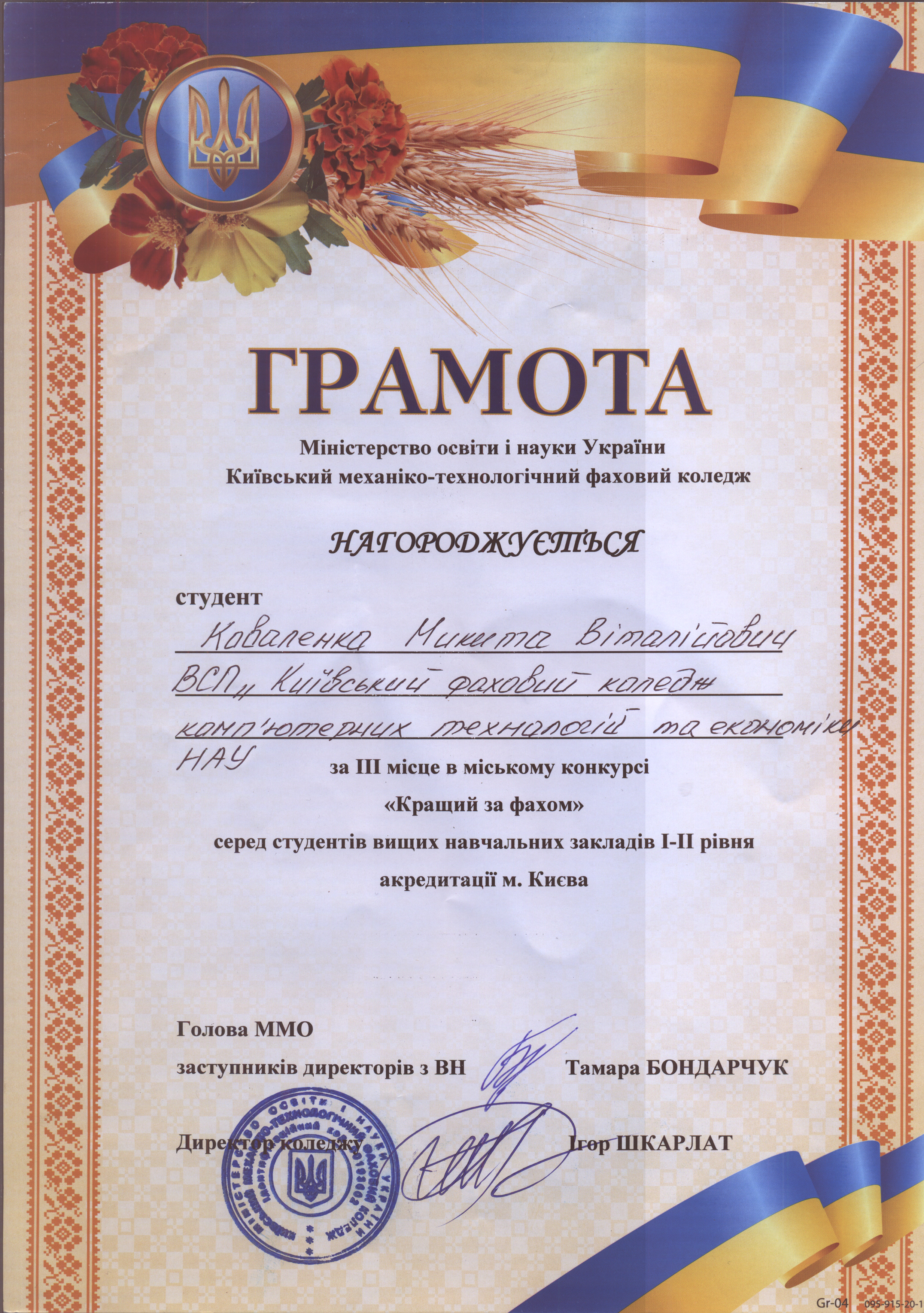 Вітаємо призера Коваленко М.В., що посів ІІІ місце у міському конкурсі «Кращий за фахом слюсар».