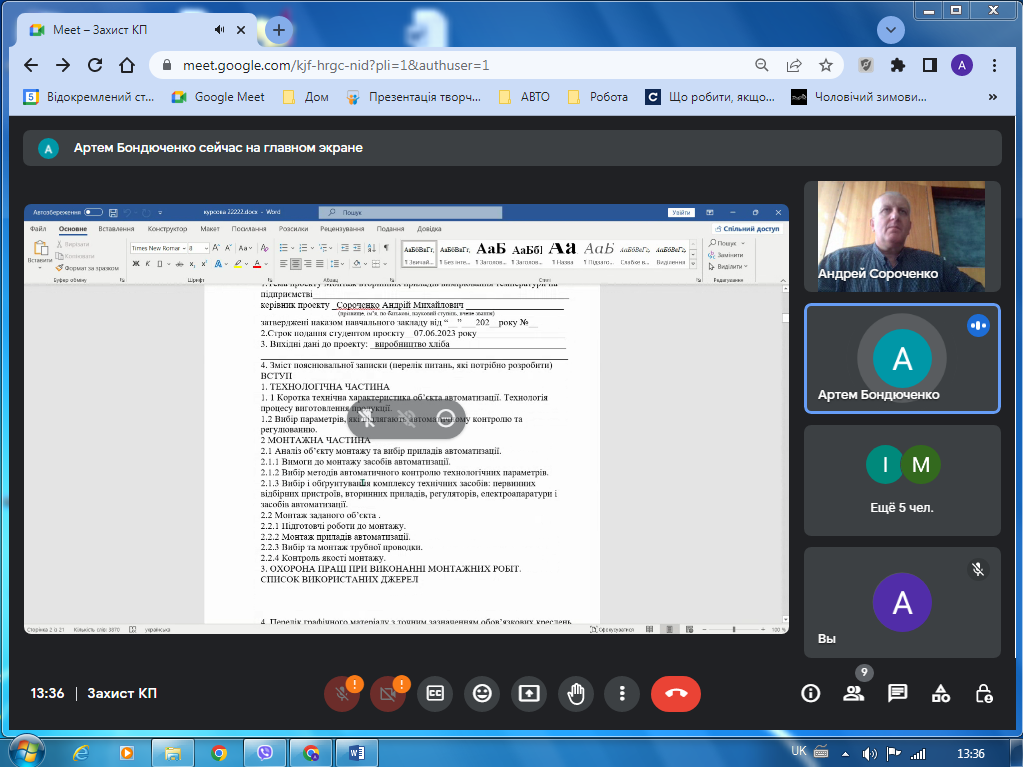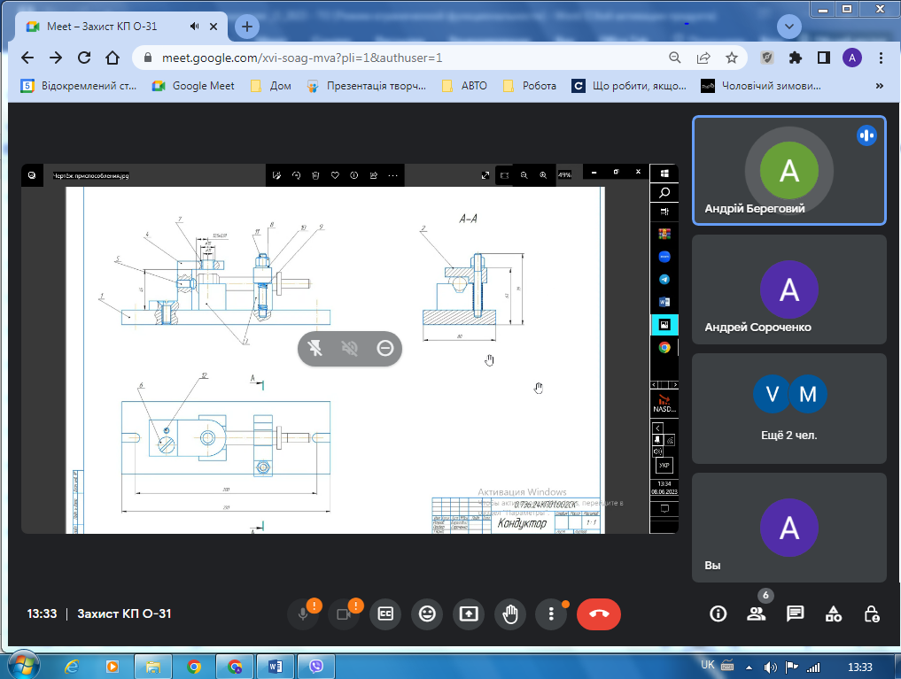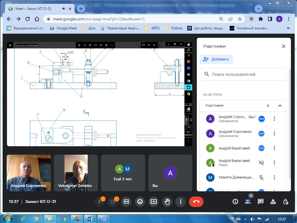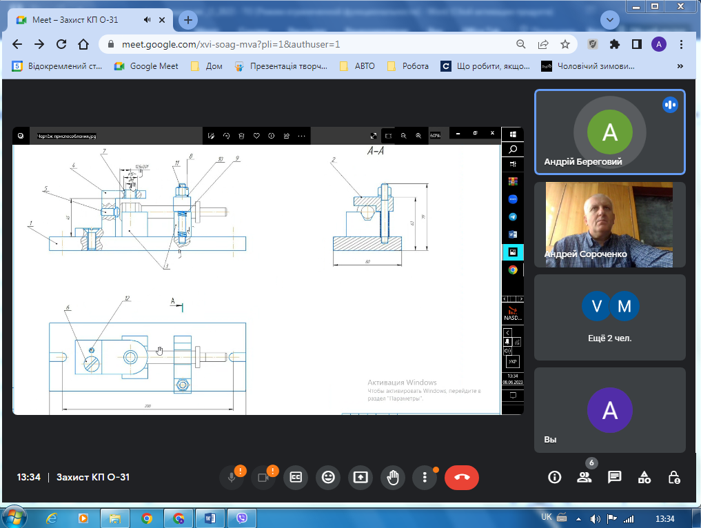 З 9 до 14 червня 2023р. на платформі Google meet з використанням дистанційних технологій відбувся онлайн-захист курсових проєктів з дисципліни «Технологічне оснащення» (спеціальність 133 «Галузеве машинобудування»). У цілому майбутні фахівці відповідально поставилися до виконання проєктів , тому виявити здобуті під час вивчення фахових дисциплін теоретичні знання та сформовані професійні навички, уміння виконувати креслення, користуватися нормативною та довідковою літературою.
