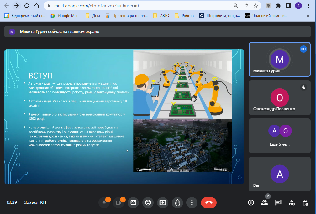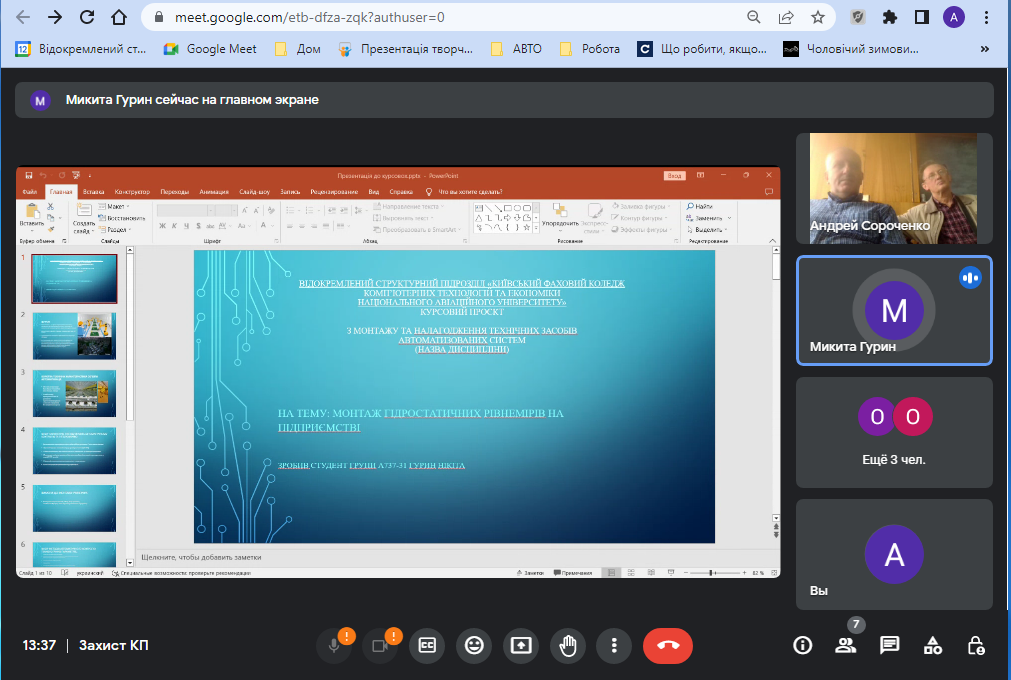 9-14 червня 2023р. на спеціальності 151 «Автоматизація та комп’ютерно-інтегровані технології», за допомогою платформи Google meet та з використанням дистанційних технологій відбувся онлайн захист курсових проектів з дисципліни «Монтаж і налагодження технічних засобів автоматизованих систем». Здобувачі освіти мали змогу в синхронному режимі, продемонструвати свої результати курсових проєктів.