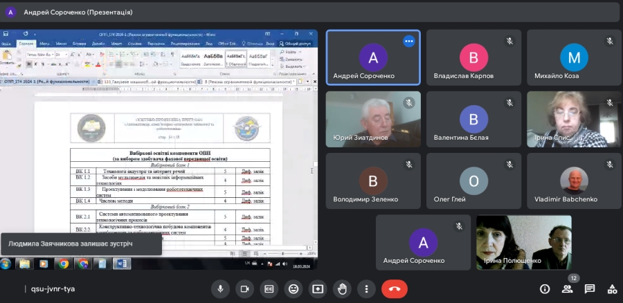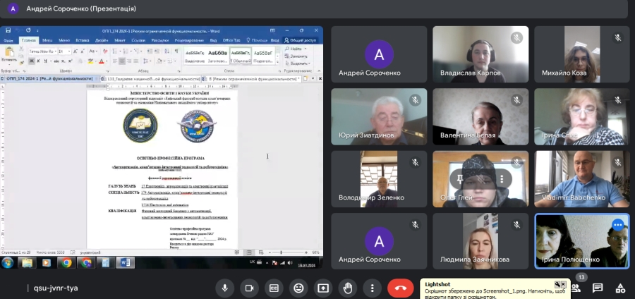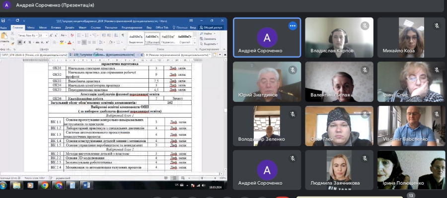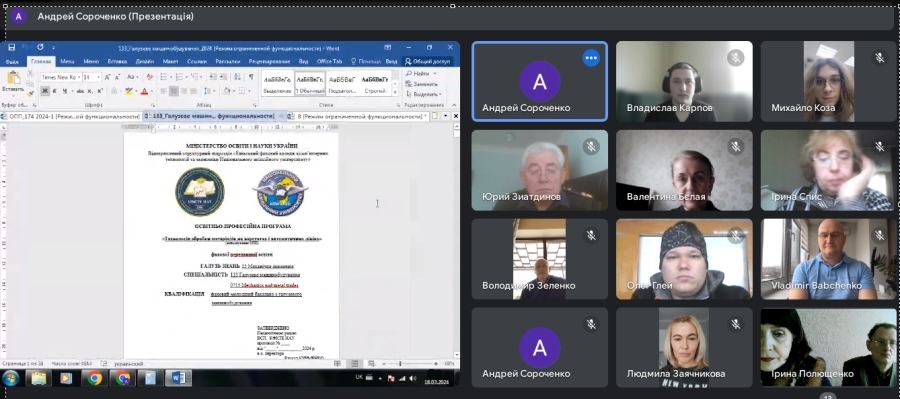 18 березня 2024 року відбулась онлайн-зустріч з головою Ради роботодавців Бабченко Володимиром Анатолійовичем, директором ПрАТ «СИСТЕМ СОЛЮШНС», директором коледжу Зіатдіновим Юрієм Кашафовичем, гарантами ОПП «Автоматизація, комп’ютерно-інтегровані технології та робототехніка» Сороченко Андрієм Михайловичем та «Технологія обробки матеріалів на верстатах і автоматичних лініях» Зеленко Володимиром Георгійовичем, викладачами спецдисциплін Полющенко Іриною Вікторівною, Бєлою Валентиною Володимирівною, Спис Іриною Станіславівною, Казанцевим Юрієм Вікторовичем, Заячниковою Людмилою Михайлівною, Глеєм Олегом Сергійовичем, представниками студентської Ради Карповим Владиславом (студент гр. А-737-41) та Коза Михайлом (студент гр. О-749-31).