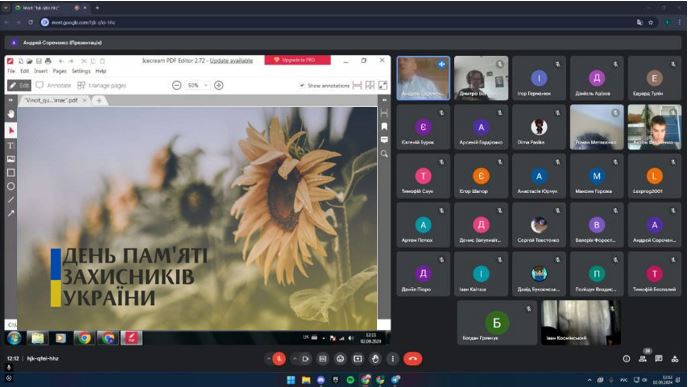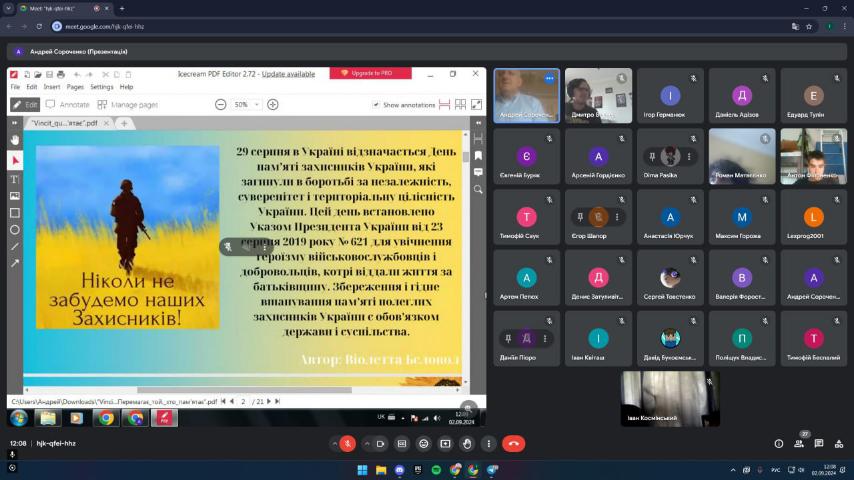 2 вересня 2024 року в групі А-776-21 було проведено виховне патріотичне заняття «Перемагає той, хто пам’ятає». Метою заходу стало формування у молоді відповідальності та гордості за свою країну.