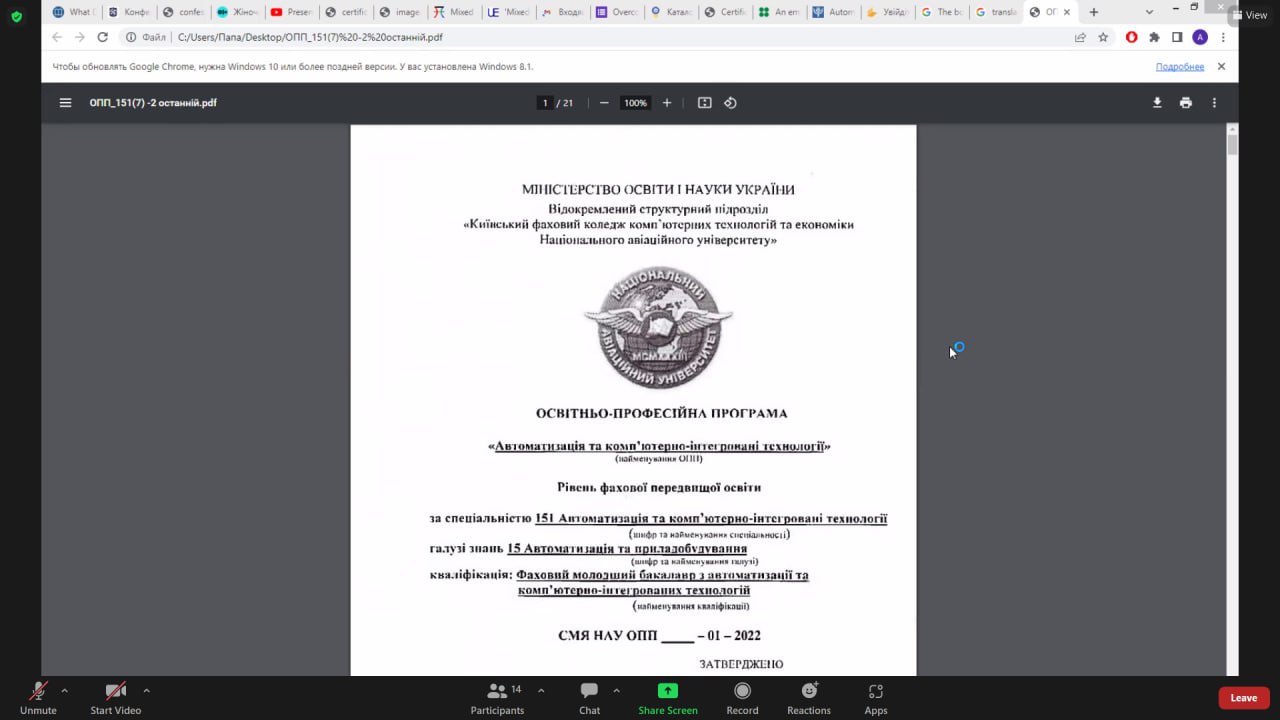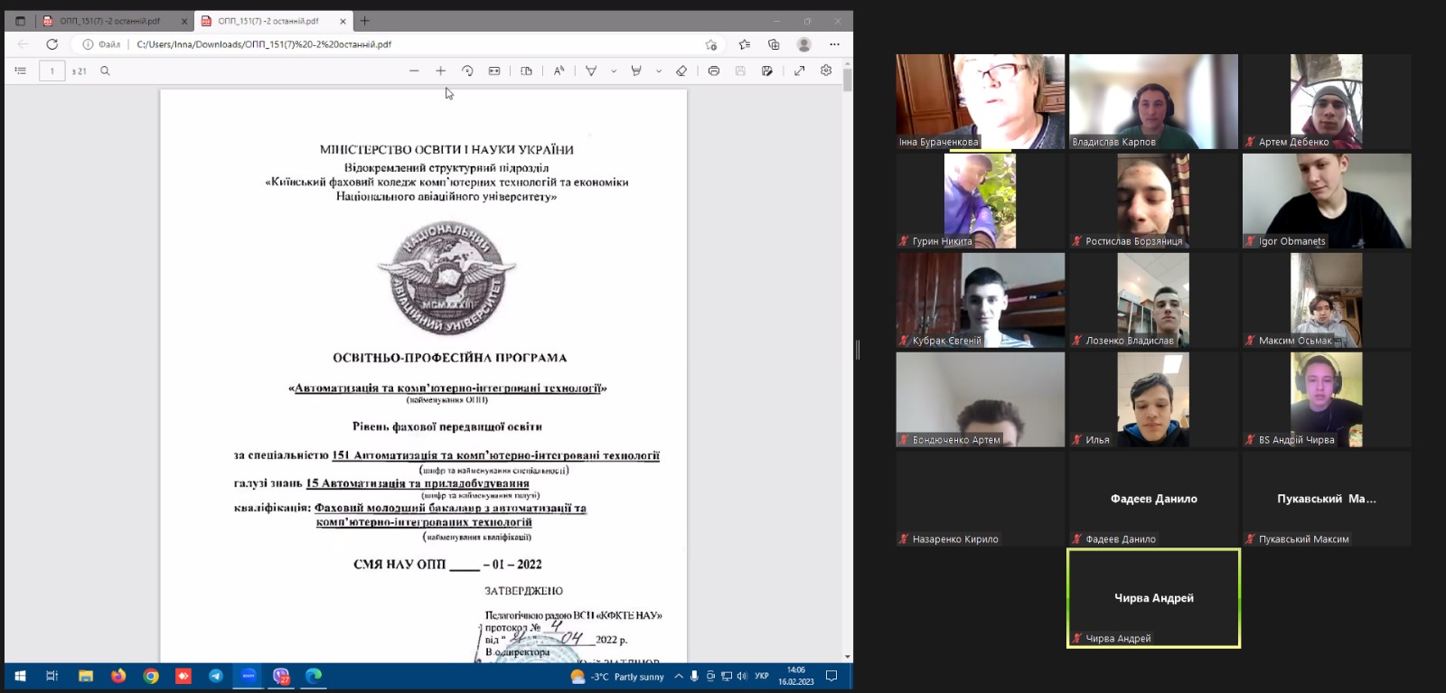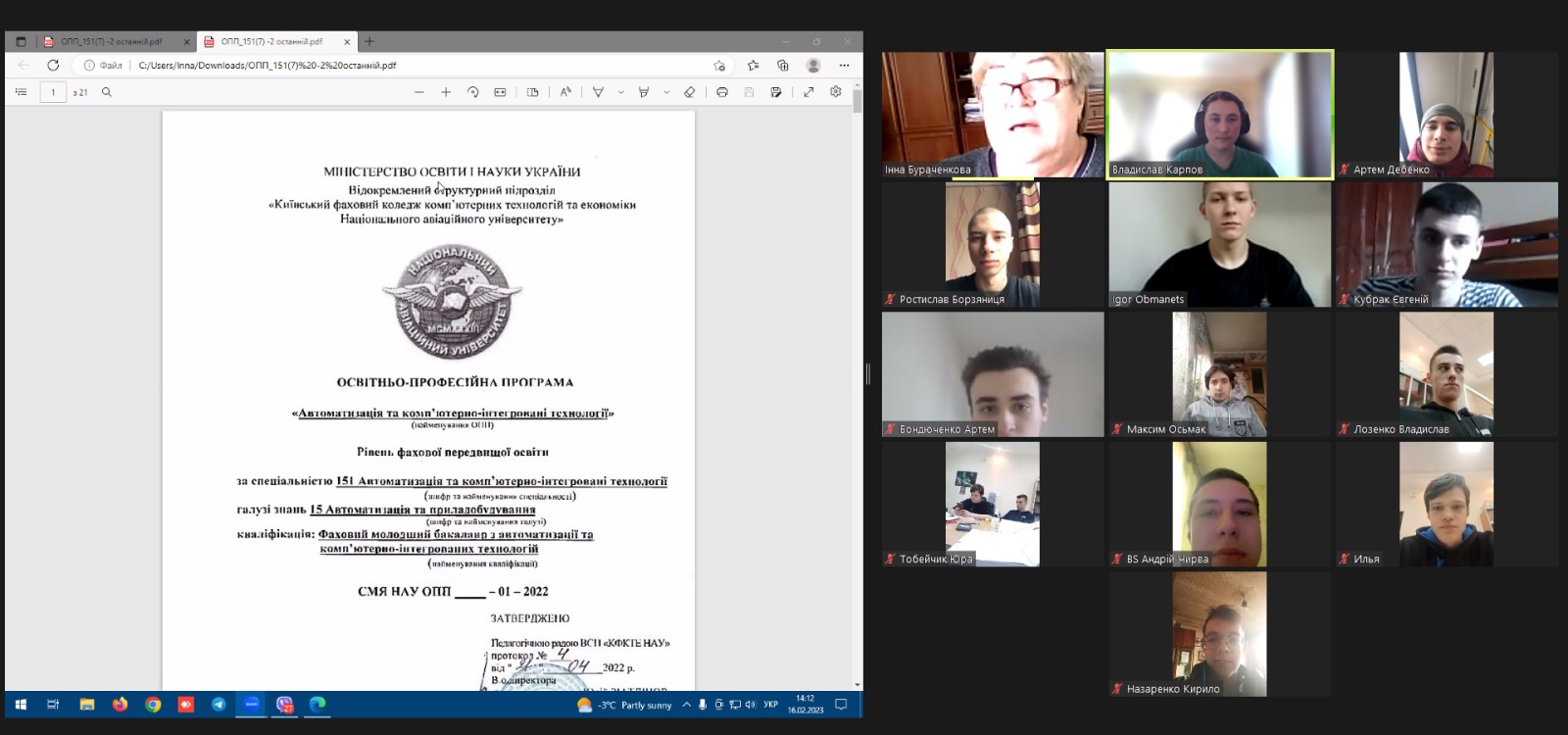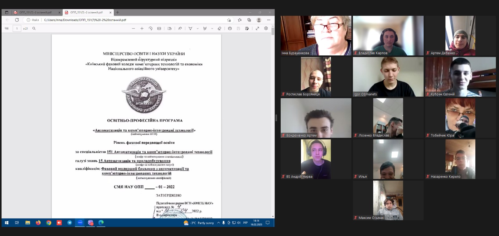 16.02.2023 р. відбулася онлайн зустріч здобувачів фахової передвищої освіти груп А-759-11, А-748-21, А-737-31 спеціальності 151 «Автоматизація та комп’ютерно-інтегровані технології» із керівниками груп Бардишевою О.Д., Мизровою А.М. та Бураченковою І.В. Присутні були ознайомлені зі структурою, змістом освітньо-професійної програми «Автоматизація та комп’ютерно-інтегровані технології» та із її освітніми компонентами. Особлива увага була приділена вибірковим дисциплінам: висвітлено їх перелік, розглянуто анотації та власне алгоритм обрання освітніх компонент цієї групи.