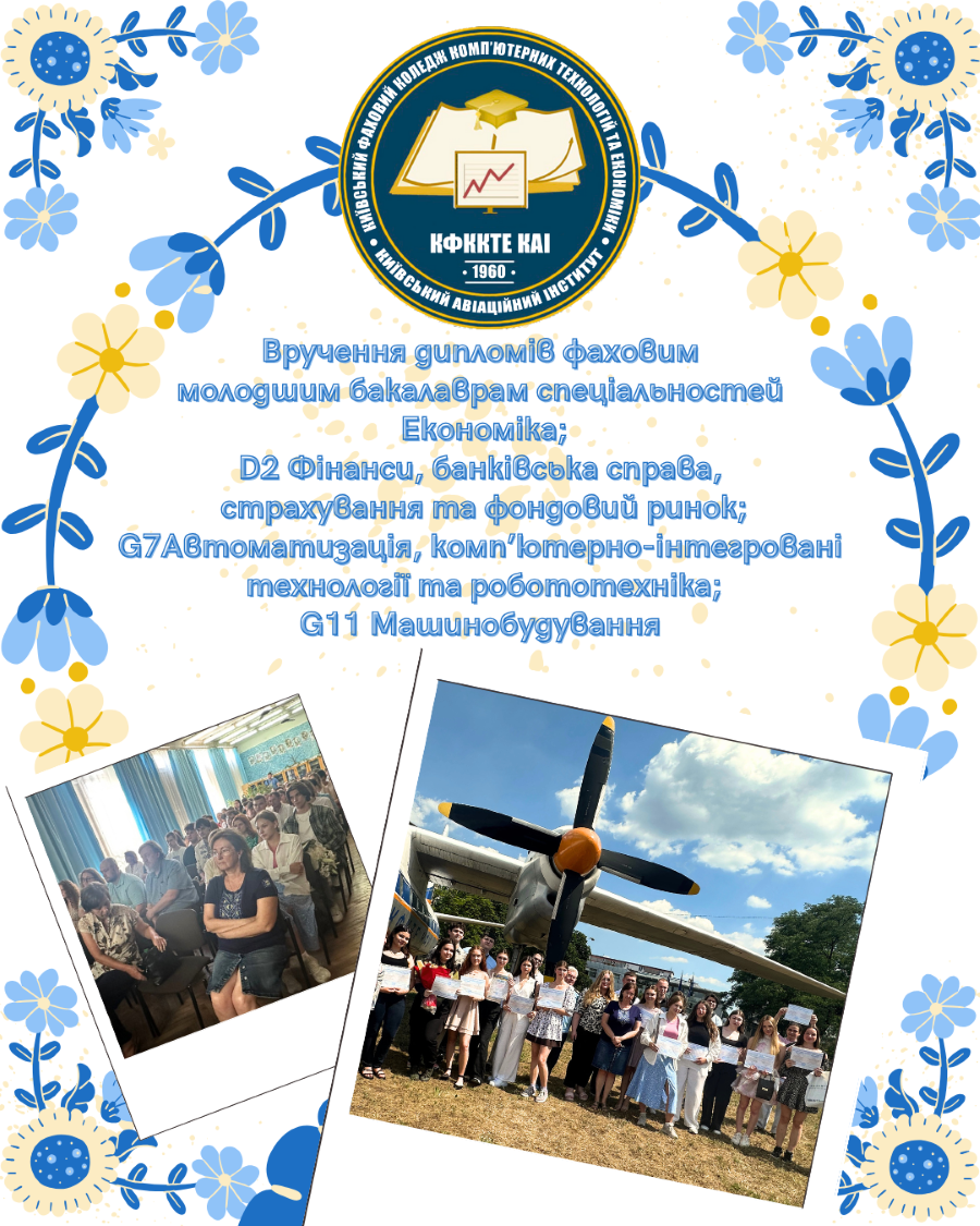 У Київському фаховому коледжі комп’ютерних технологій та економіки Державного некомерційного підприємства «Державний університет «Київський авіаційний інститут» 14 липня 2025 року відбулося вручення дипломів фаховим молодшим бакалаврам одразу кількох спеціальностей: 📊 Економіка 💰 D2 «Фінанси, банківська справа, страхування та фондовий ринок» 🤖 G7 «Автоматизація, комп’ютерно-інтегровані технології та робототехніка» ⚙️ G11 «Машинобудування»