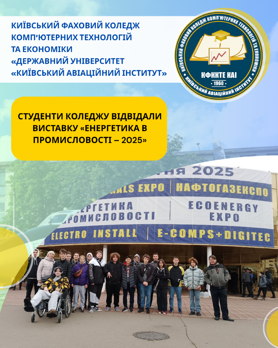 15 жовтня 2025 року студенти спеціальностей «Галузеве машинобудування» та «Автоматизація, комп’ютерно-інтегровані технології та робототехніка» разом з викладачами комісії Андрієм Сороченко, Олегом Глеєм, Іриною Полющенко відвідали ХХІІ Міжнародну спеціалізовану виставку «Енергетика в промисловості».