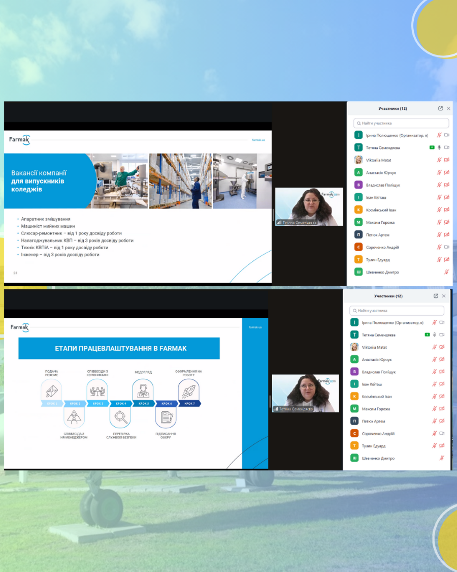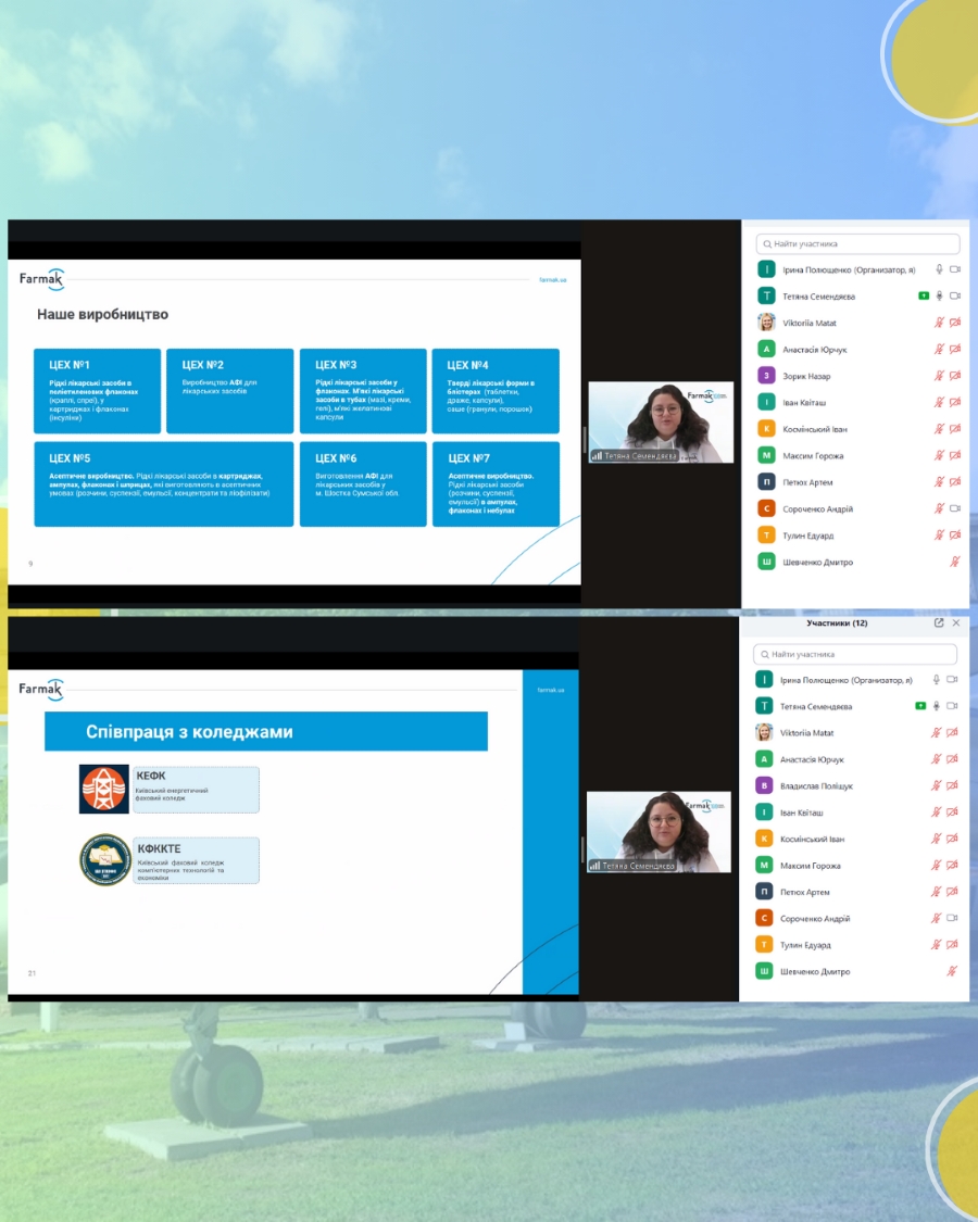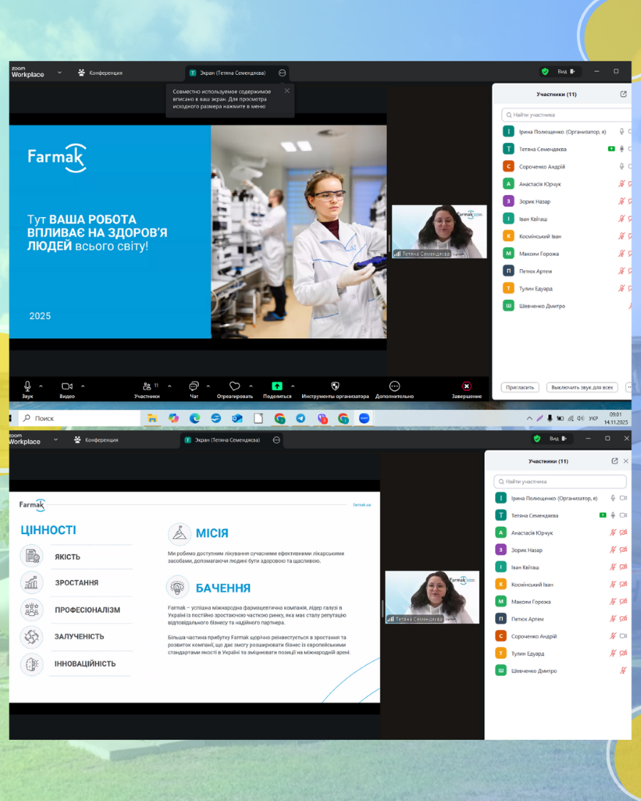 Студенти 3 курсу спеціальності «Автоматизація, комп’ютерно-інтегровані технології та робототехніка» 14 листопада 2025 року взяли участь в онлайн-зустрічі з Тетяною Семендяєвою, HR-фахівчинею відділу підбору та адаптації персоналу провідної фармацевтичної компанії «Farmak».