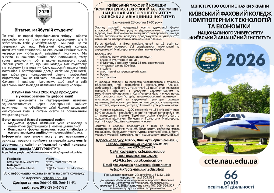 Більше інформації про наш коледж Ви можете знайти на офіційних сторінках: Офіційний сайт коледжу: ccte.nau.edu.ua Facebook: https://tinyurl.com/4byh9t54 Instagram: https://tinyurl.com/52tnb3fe